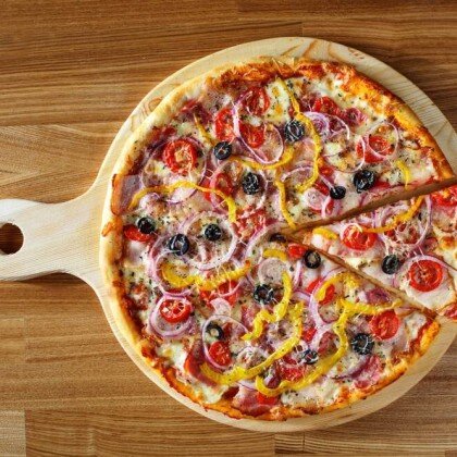 Копчёное куриное филе, свежие шампиньоны, красный лук, сладкий перец, сыр Моцарелла, соус сливочный.