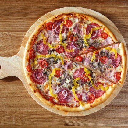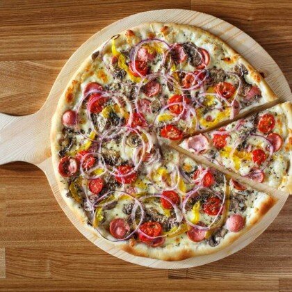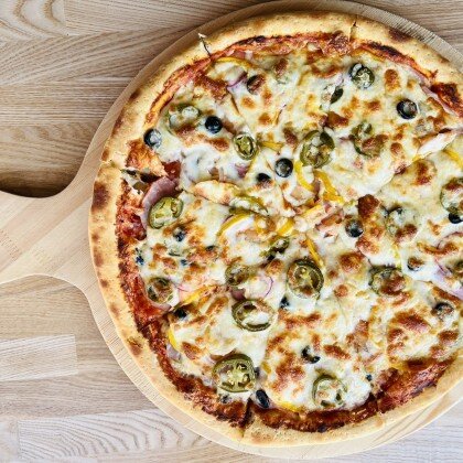 Бекон, маслины, помидоры Черри, красный лук, сладкий перец, соус из томатов, сыр Моцарелла.