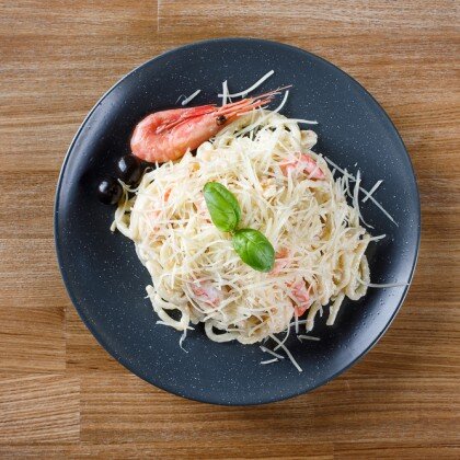 Свежая паста, бекон, сливочный соус, сыр Пармезан, оливковое масло, базилик